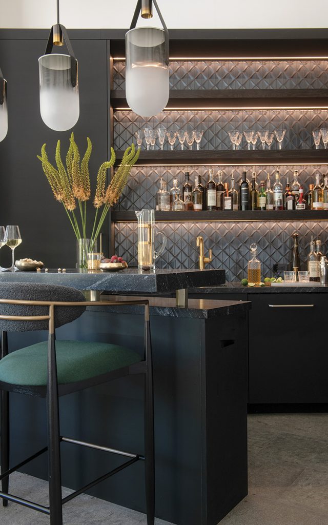 In a svelte game area tucked to the left of the front door, art deco inspiration flourishes. Its moody bar area is anchored by a wall of dark glass tile with dimensional color, accentuated by custom track lighting. “In early design meetings, the homeowner really fell in love with the color and pattern of specific tiles,” shares Hunt. As a result, the design of many rooms was uniquely driven by colorful tile rather than more conventional inspiring elements like furniture or rugs.