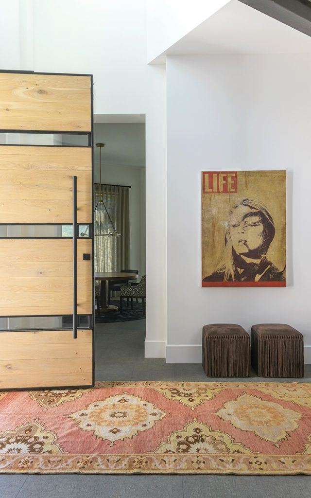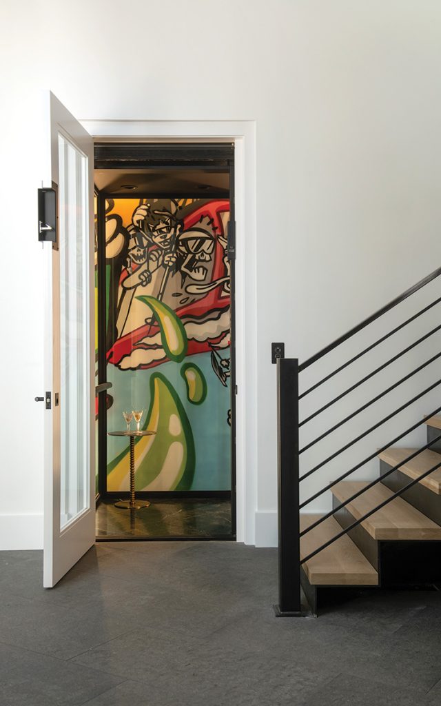 Step into the entry, and it becomes evident that this is a home full of unexpected moments. A monumental custom pivot door introduces the contemporary flair with its horizontal planes of wood and glass. Inside, immediate doses of color emerge, including the home’s custom-graffitied elevator shaft located off the entry beneath the modern staircase.
