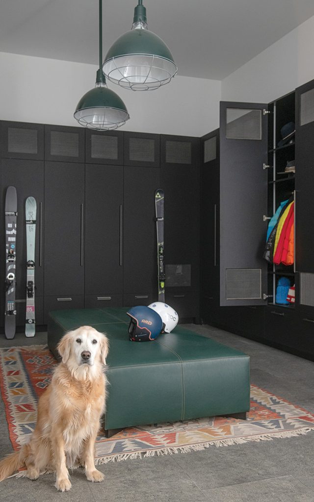 The bar’s dark color palette continues in the entry level’s powder room and storage area alike. The powder room boasts chic houndstooth tile and a gleaming black marble vanity, while the ski-in, ski-out gear room features entirely black customized millwork.  Each locker is compartmentalized to the inch for specific items, from ski coats to dog leashes.