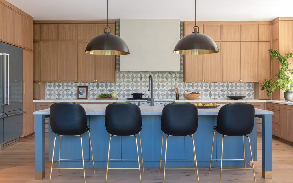 Personalized detail was similarly expressed in the kitchen, on the next level of the home. “This was easily one of the most customized kitchen millwork projects I’ve been a part of,” says Hunt. But despite the intricate needs for her kitchen’s functionality, the wife surprisingly based the room’s design, once again, on tile. The gray-blue tones of  the backsplash’s New Ravenna tile repeat on colorful appliances and on the cabinetry of the island and adjoining pantry.