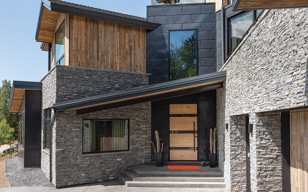 The home’s exterior, with its neutral stone and reclaimed wood slats, doesn’t strongly signal the colorful contemporary mashup waiting inside, but amid these conventional mountain home materials are hints of the modern whimsy that persists through every detail of the design.