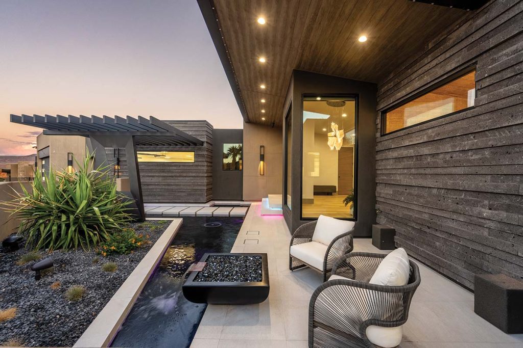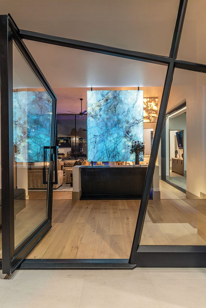 Step inside the front pivot door and the design language immediately becomes clear: contemporary, refined and deeply rooted to the land. A two-sided resin panel—resembling backlit Blue Labradorite granite—separates the entry from the great room, creating a striking focal point. “It fosters a fluid feeling by connecting with the entry’s water feature and the pool out back,” Roberts explains.