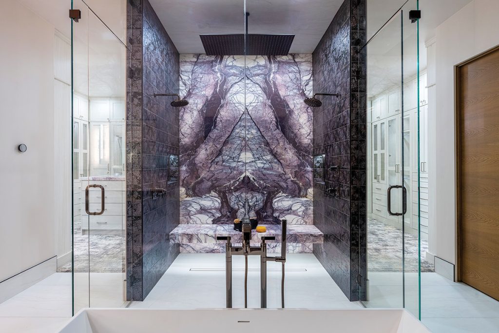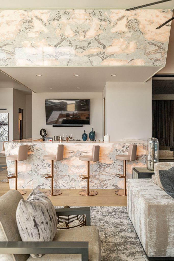 Across the room, a custom bar adds another bold gesture. Its backlit marble slabs echo the fireplace geometry, reinforcing the home’s sculptural language. “The inverse angle of the bar mirrors the fireplace wall,” Roberts explains. Like the backlit quartzite vanity in the powder room and the book-matched lilac marble shower in the primary bath, the bar’s stone was chosen to elevate the experience. “I love mixing the primitive essence of stone with the clean lines of contemporary design,” she adds.