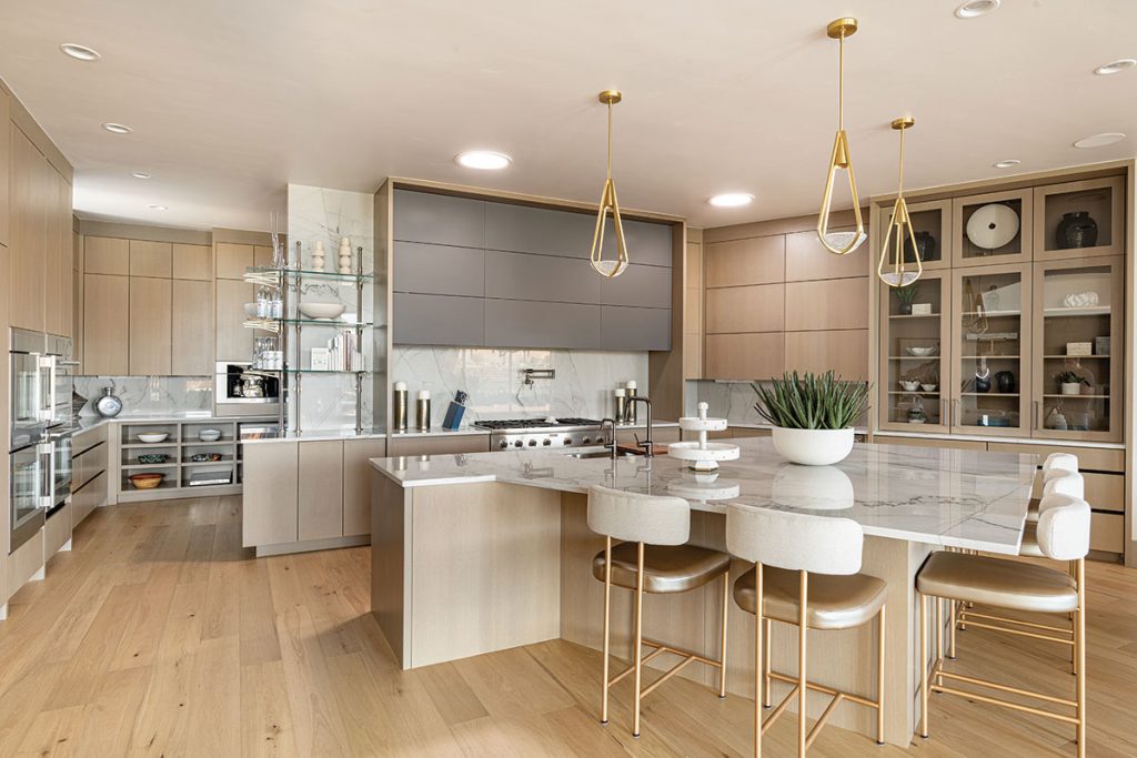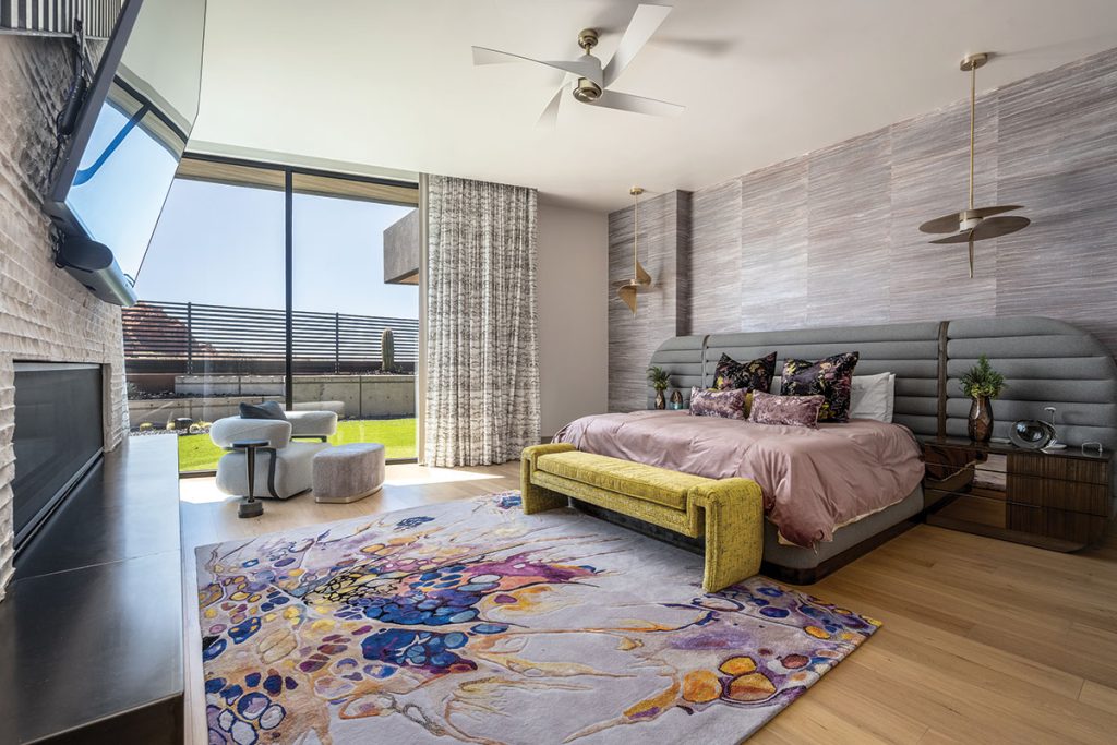 That tension—earthy yet refined—guides the home’s color palette and materials. The homeowners weren’t drawn to neutrals, so Roberts looked to the surrounding desert for inspiration. “We used rift-sawn white oak cabinetry with a custom taupe-coppertone finish that evokes the color shift at dusk,” she says. Throughout, moody tones are layered with smoky glass, steel accents and wallcoverings that reflect light with a soft glow. Darker elements are balanced by metallics and grounding finishes like Brizo’s Black Onyx and Emtek’s slate ash gray plumbing. “That contrast brings a modern edge without feeling cold,” Roberts notes.