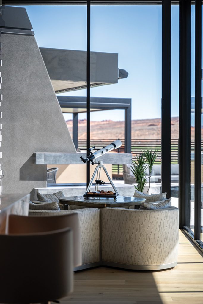 McQuay Architects custom-designed the monolithic, three-sided fireplace that anchors the interior living space and seamlessly complements both the interior and exterior stone cladding. The cantilevered hearth and mantle, built by Andy Funderburk of Funder Welding and Design, accentuate the feature’s asymmetric, dramatically detailed form. Expansive windows frame views of Sand Hollow Golf Course and red rock cliffs.