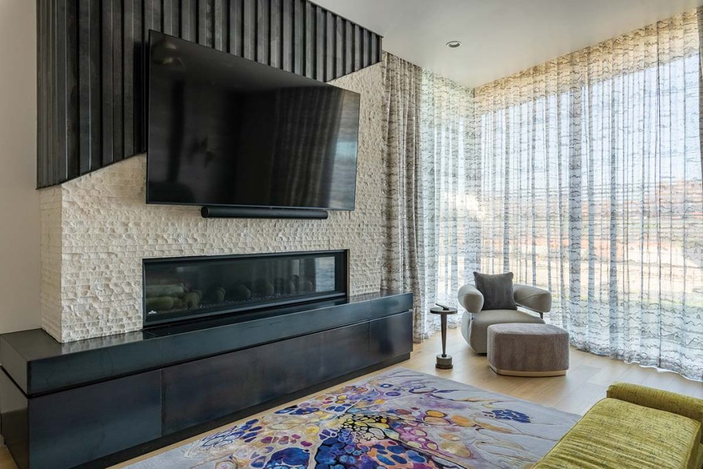 Stone plays a starring role in the home, grounding its modern architecture with permanence and drama. In the great room, a three-sided fireplace commands attention.