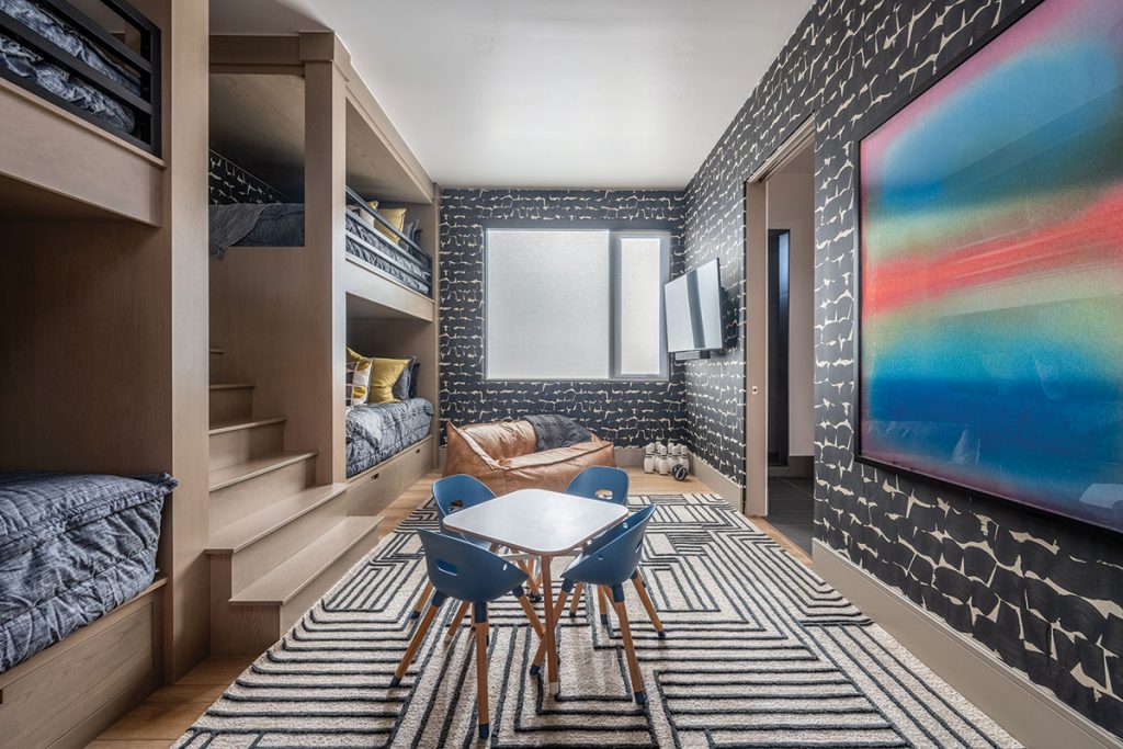 Boldly patterned York wall covering enlivens the bunkroom space, where queen-over-queen bunk beds team with a children’s entertainment and play space to make this area ideal for grandkids and family to gather. The metal wall art is by Leftbank Art; the bunk beds are by Riverwoods Mill.