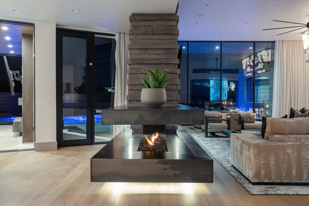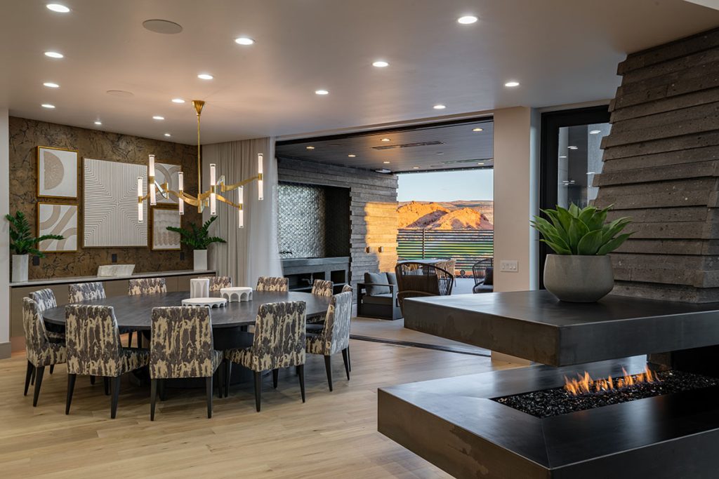 As evening falls, the three-sided fireplace becomes a luminous centerpiece, its sculptural form designed by McQuay Architects to echo the home’s stone inside and out. The cantilevered hearth and mantle, fabricated by Andy Funderburk of Funder Welding and Design, emphasize the fireplace’s bold asymmetry and striking presence. Framed by expansive windows, the glow of the fire plays against views of the lighted pool, Sand Hollow Golf Course and the surrounding red rock cliffs.