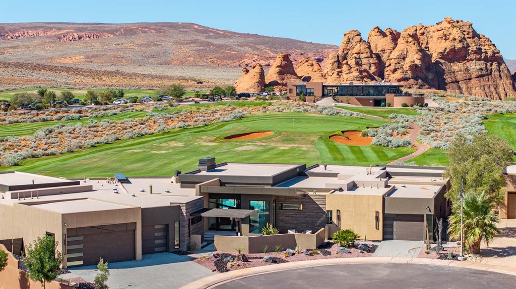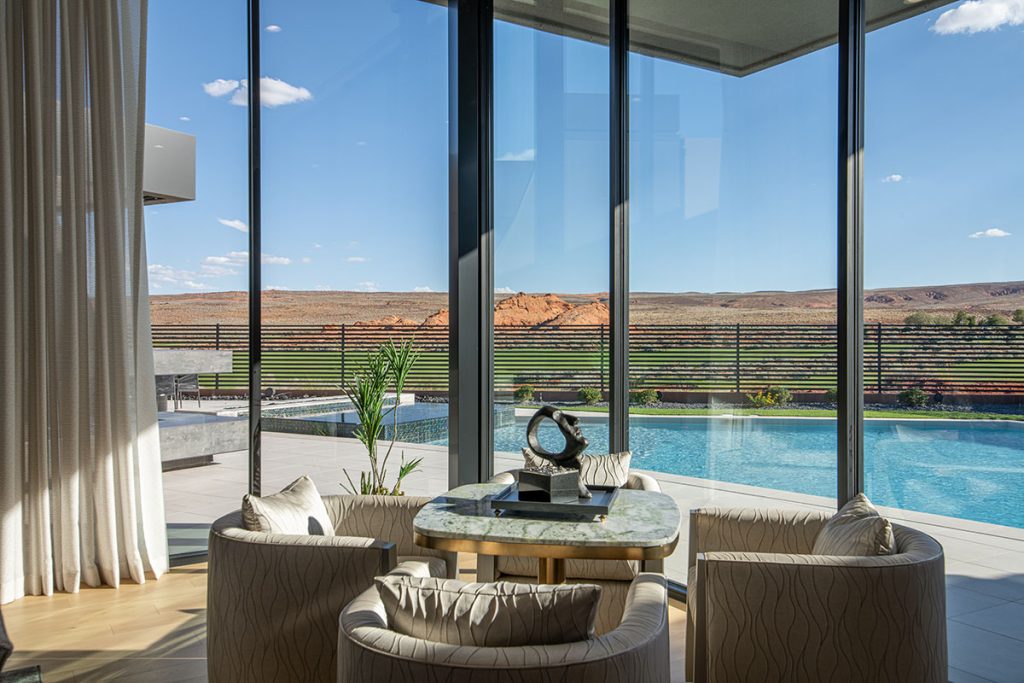 As seen from the front, the Hurricane-area residence—nestled between two golf course fairways with the clubhouse perched like a postcard on a gentle rise—promised distinction. Architect Rob McQuay recognized the rare opportunity to frame the views so precisely that no neighboring home would intrude, allowing the landscape to take center stage.