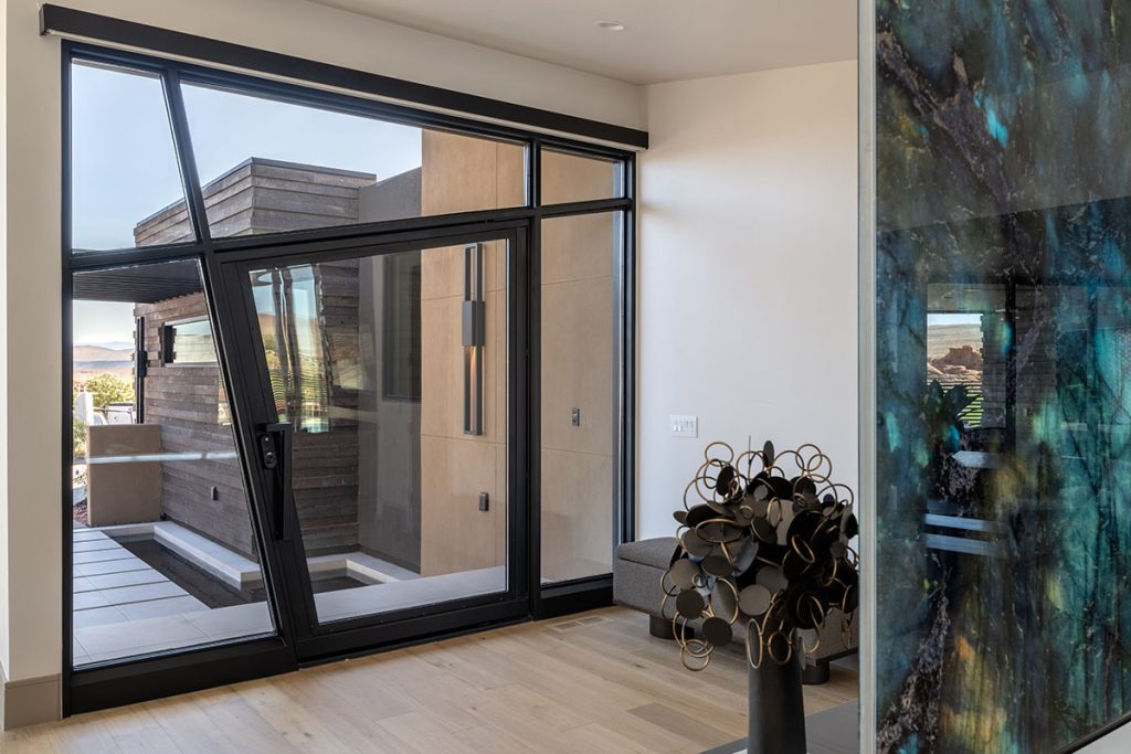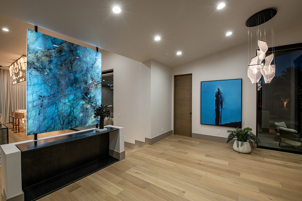 Inside the front door, a suspended Stardust resin panel by Tecnografica creates a striking partition between the entry and the great room. Its shimmering surface evokes backlit Blue Labradorite granite, casting a subtle glow that shifts with the light and sets an elegant, atmospheric tone as guests enter the home.
