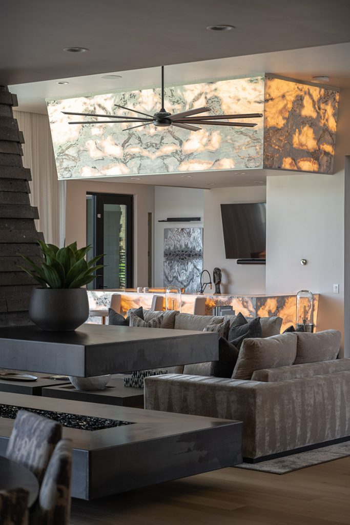 Backlit marble slabs sculpt the bar that links the great room and family game room, casting a luminous glow across the space. Designed with an inverse angle that echoes the fireplace wall, it serves as a striking centerpiece in the home’s main living area, blending artistry with elegance.