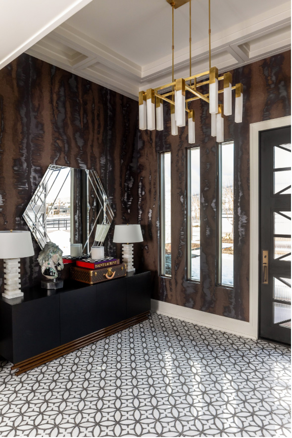 Upon entry to the home, guests are greeted by a stylish foyer. Complementing a lively New Ravenna tile floor, Holly Hunt wallpaper covers each wall. An ebony walnut credenza anchors the space. On top, a display of the homeowners eclectic treasures, including a vintage Louis Vuitton trunk and a green marble horse sculpture. “It’s a vignette that tells a story, and a foyer that makes a statement,” Chipman says.