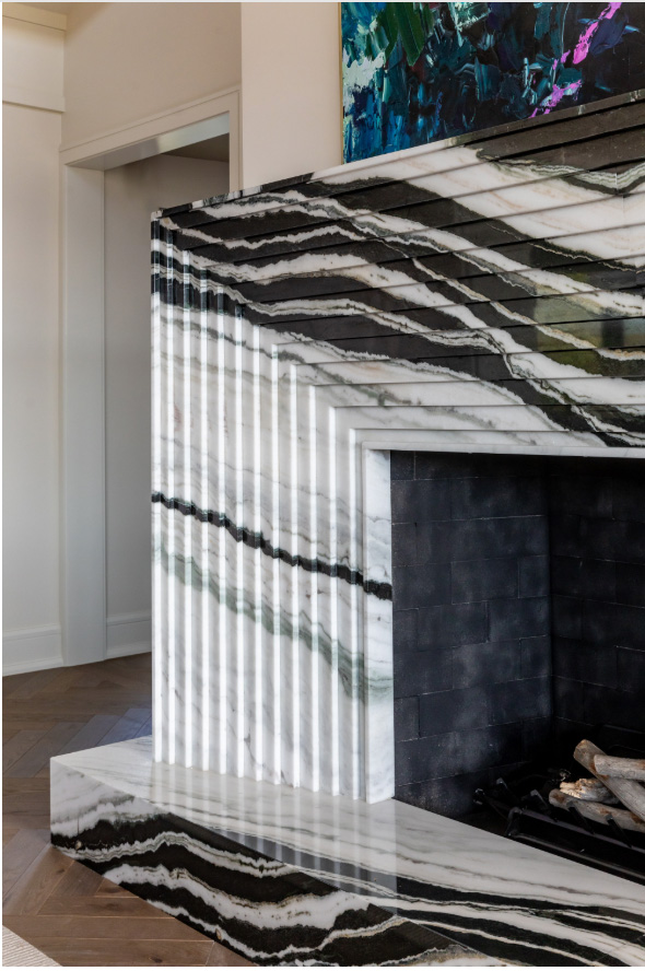 Made up of five carefully matched slavs of Bianco Lasa Macchia Vecchia, the stepped-stone fireplace surround brings the drama to the first liveable room of the house.
