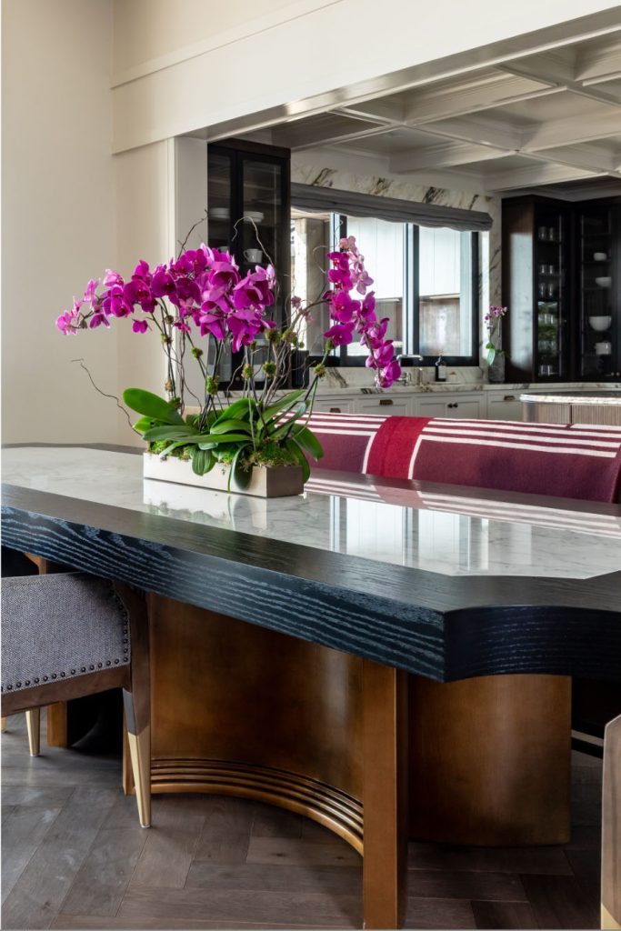 Nearby, the dining room is all about finesse and craftsmanship. At the center of the vignette, a stunning 132-inch dining table from Shine by Sho radiates luxury and glamour. A gilded base, marble inlay and clipped corners deliver a tailor-made feel. To keep the visual flow balanced, the designers paired Hickory Chair dining chairs and a custom banquette as seating, softening the overall look. “This is one of our favorite design moves,” says Chipman. “Fewer chair legs mean less visual clutter, and versatility adds interest.”
