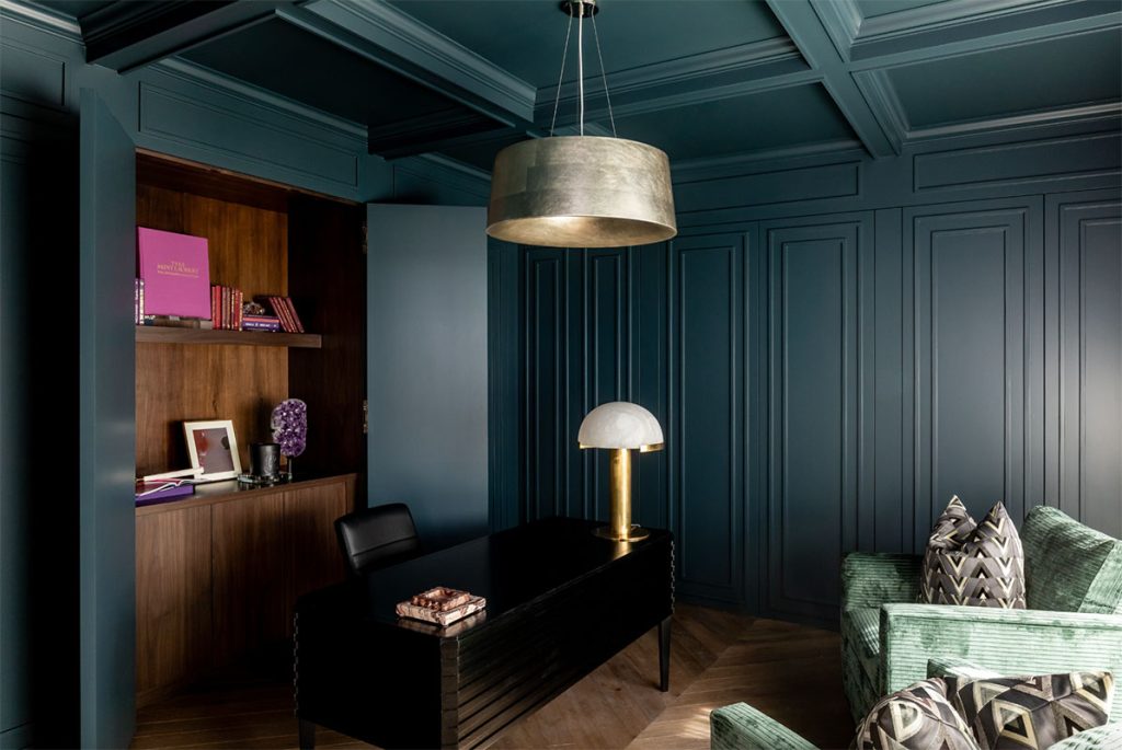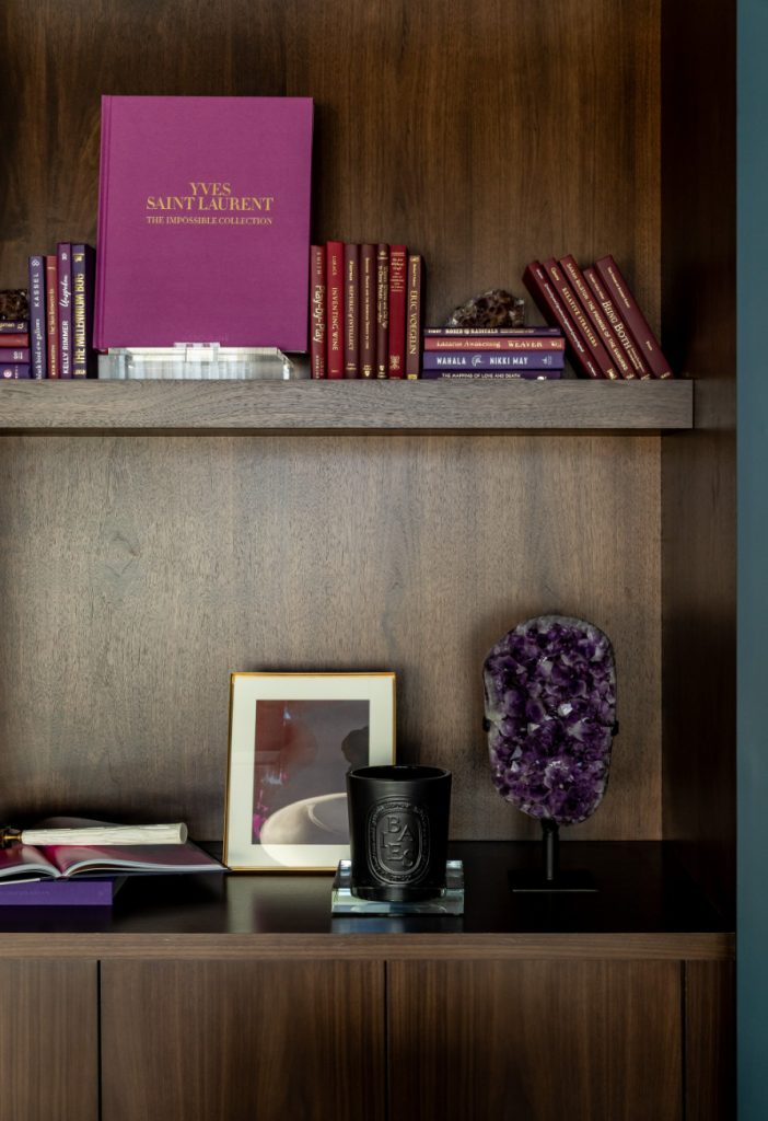 The home office houses a little secret: hidden cabinetry tucked behind custom cabinetry by PepperTree Cabinets. When closed, the color-drenched room is a moody, serene retreat. When revealed, hidden shelves offer stylish functionality with a pop of maroon that flawlessly complements the room’s Lead Gray Benjamin Moore paint.