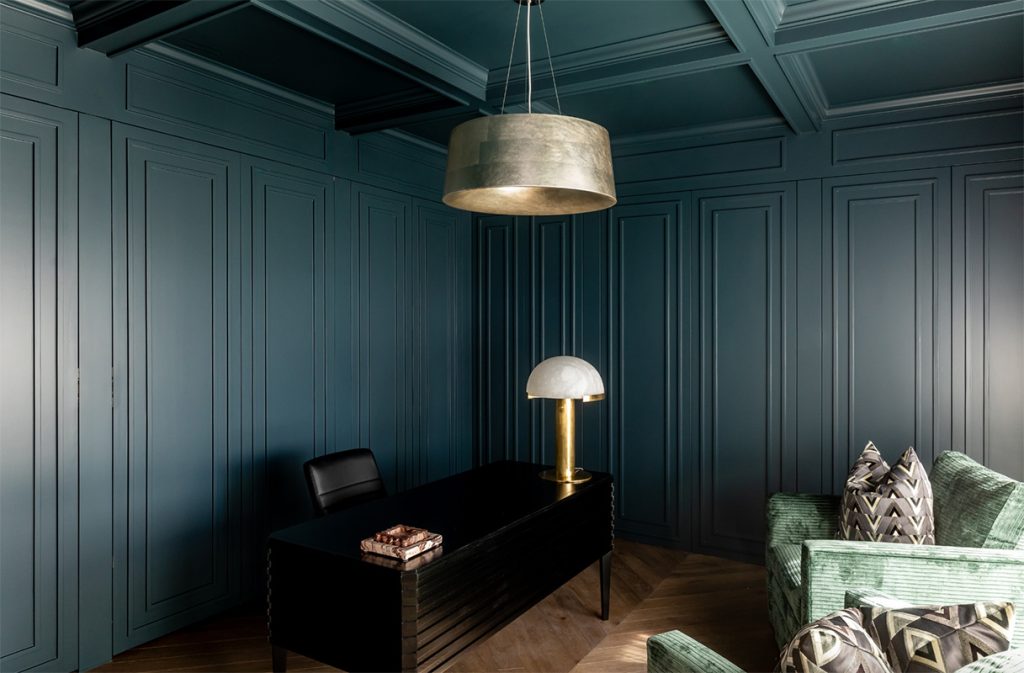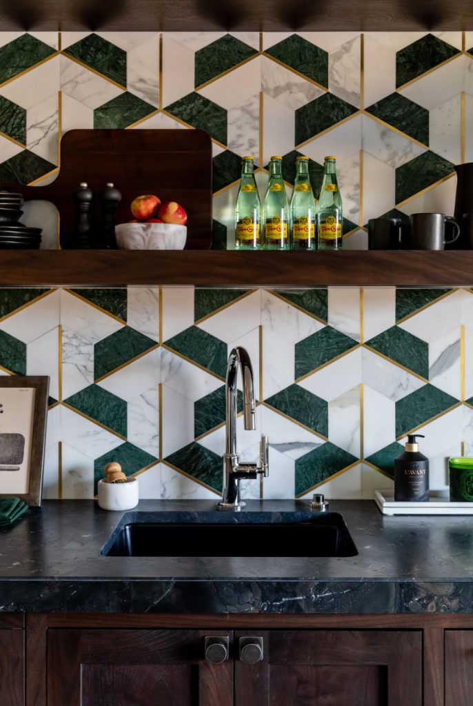 With it’s own private entrance, the property’s guest house was designed to have a vibe all its own. Rich materials like dark walnut cabinetry and emerald green accents give the space a distinctly masculine energy. “The details evoke the feel of a stately gentleman’s club, but with a hint of Art Deco glam woven in for good measure,” says Chipman.