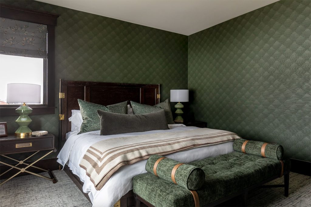 In the guest bedroom, the emerald tones get leveled up in the best way. Moody layers of green on green, from the Zak + Fox Wallcovering to the cozy tufted bed bench create an escape both restful and inviting.