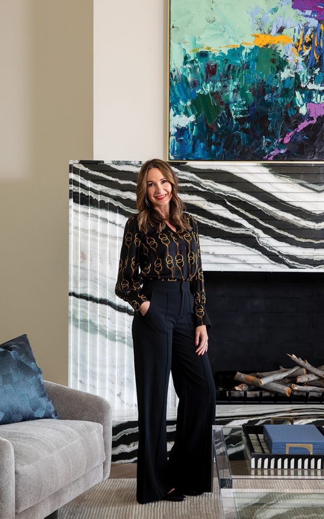 The great room’s soaring ceilings, colorful abstract art and high-contrast marble slabs on the fireplace set the compelling tone of this home’s urban-meets-mountain design.