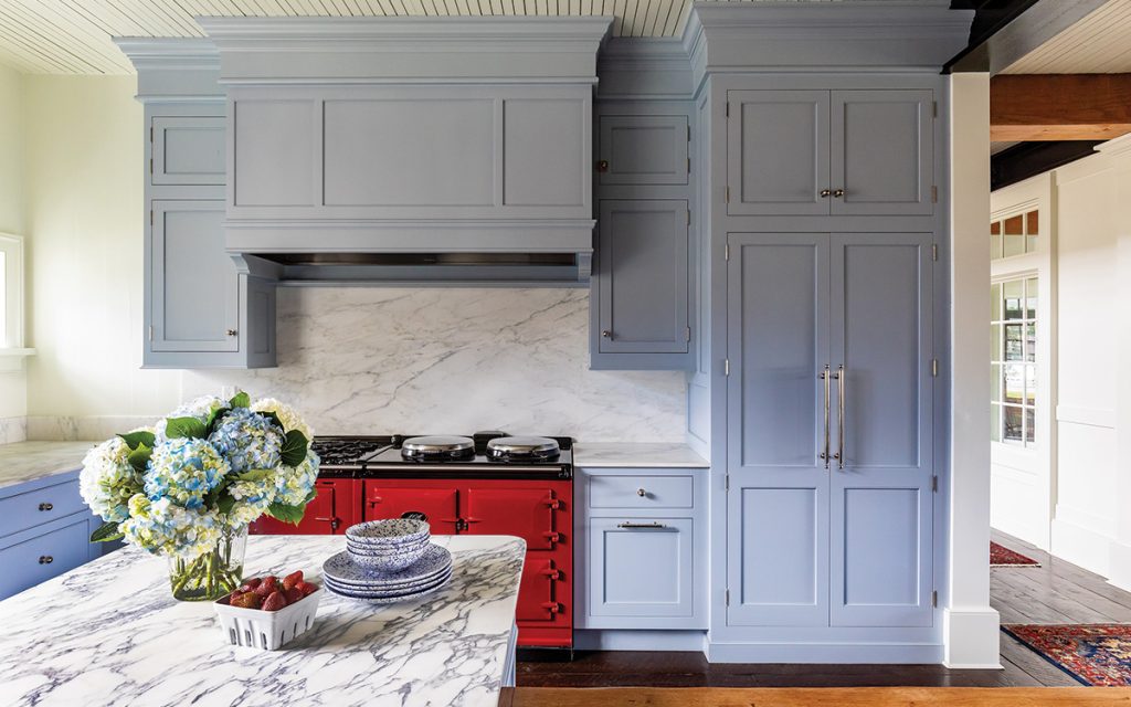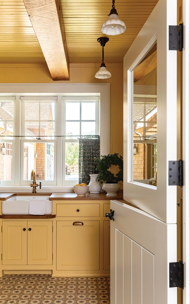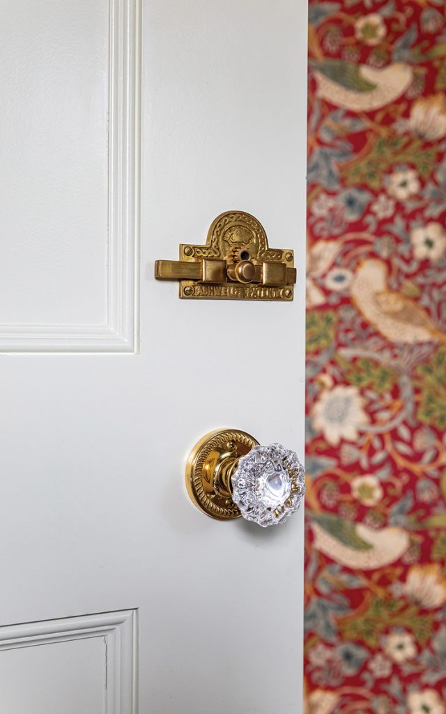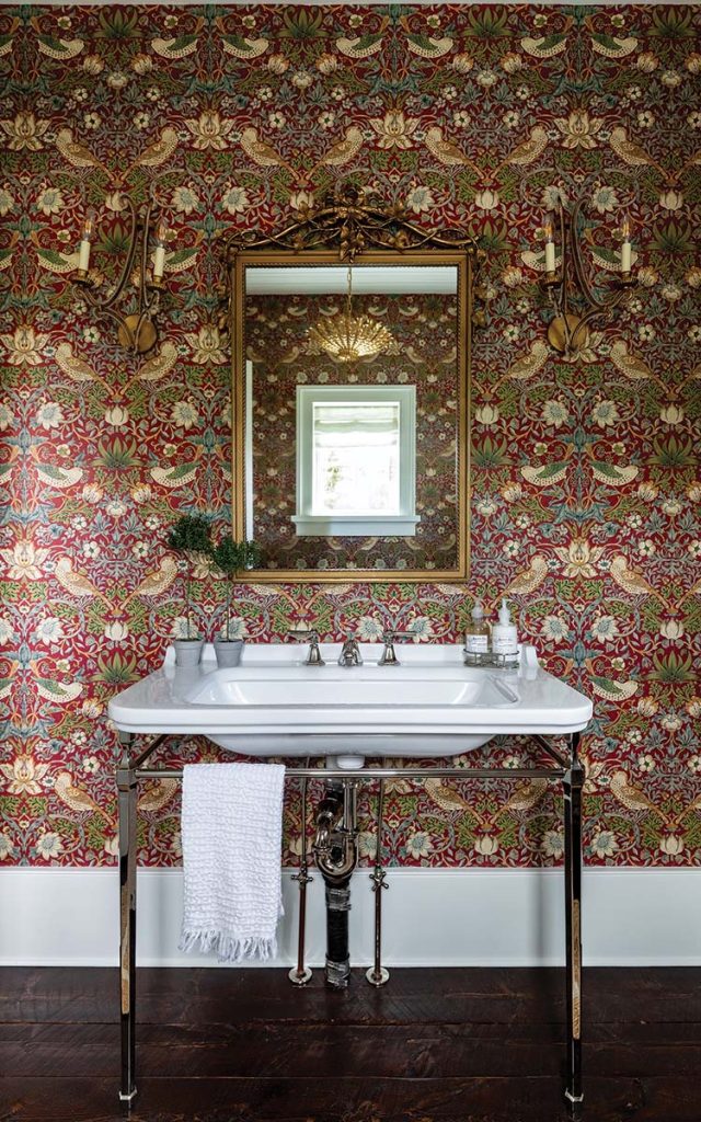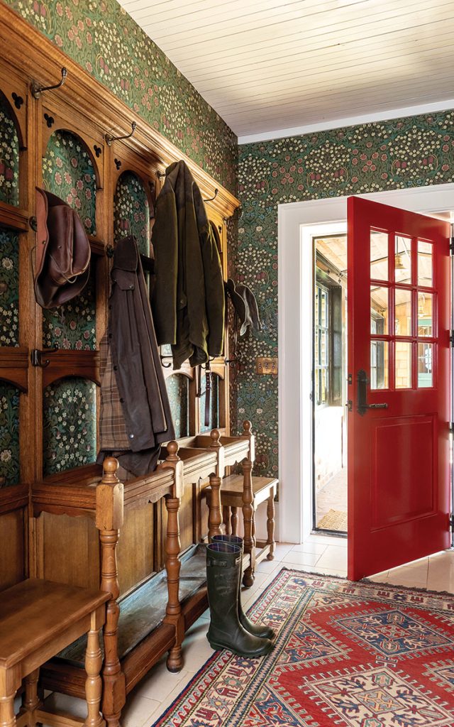 English farmhouse details flourish throughout the Best’s home: a traditional AGA Range in a rich red hue that matches the red front door; cheerful shades of paint such as the pantry’s butter yellow from UK-based Farrow & Ball; hand-pressed tiles from Devol Kitchens in England for the laundry room; and furniture and walls dressed with fabrics and wallpaper by, of course, Morris & Co.