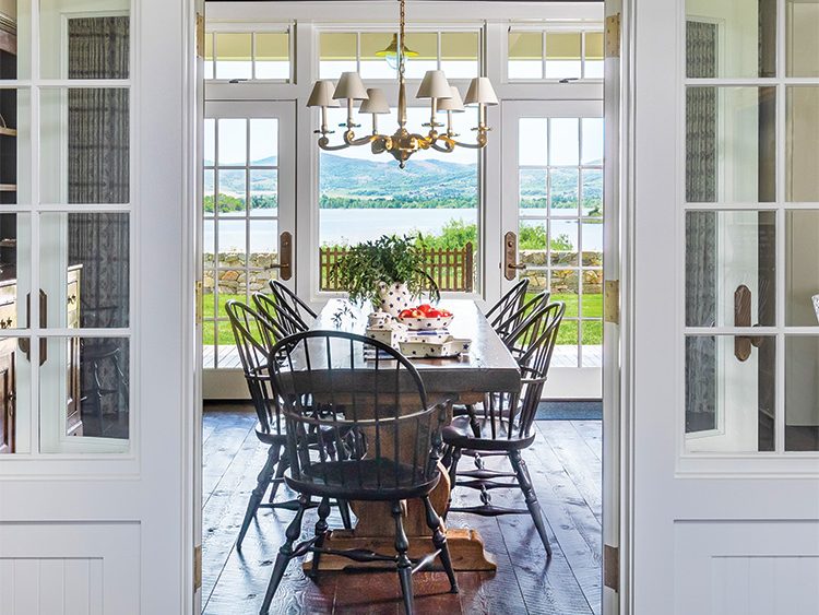The couple designed the house around the spectacular views, as seen through the large dining room picture window flanked by two doors with wood-mullions. Handmade Windsor chairs by Jock Jones surround the 18th-century Belgian monastery table. Photo by Lindsay Salazar.