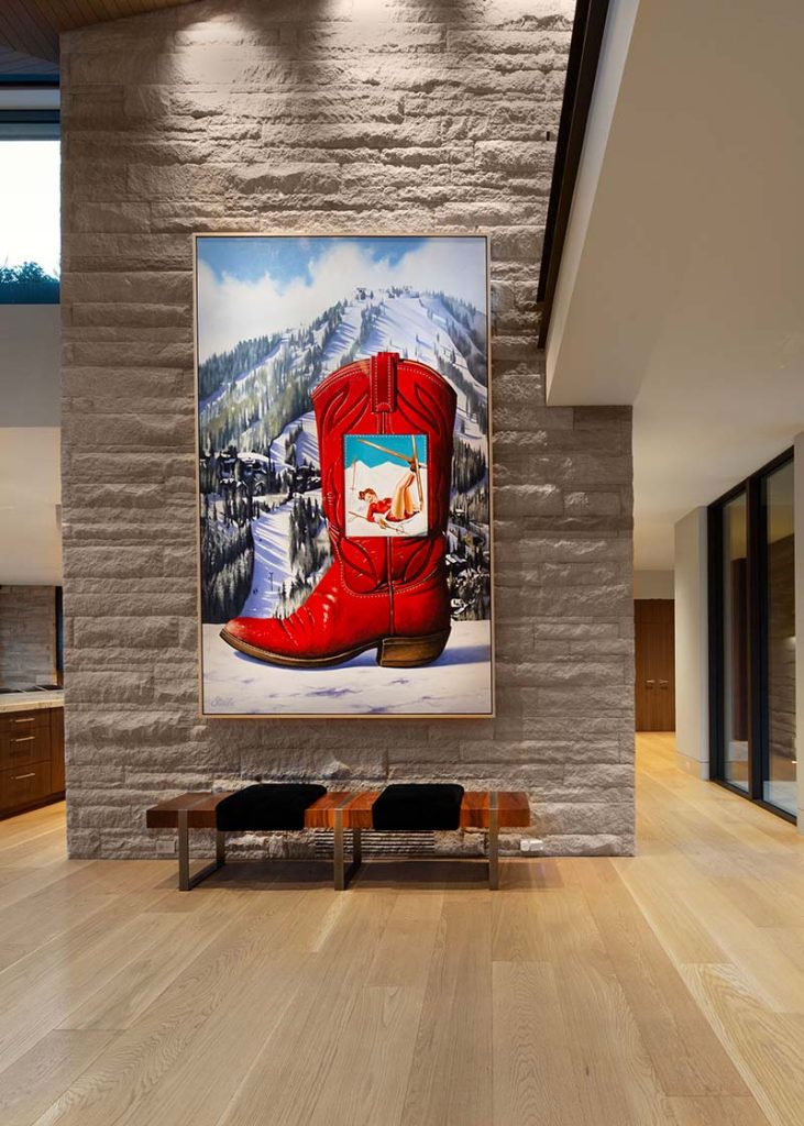 Looking to the right is a stone wall perfect for a large artwork. This custom piece shows Deer Valley behind the red boot.