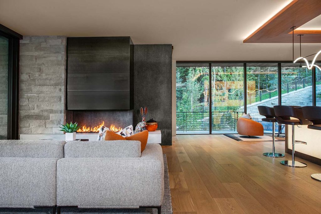 Recently I was reminded by how long I have been taking photos when I returned to a lot in Bald Eagle. I recognized the spot where I had earlier photographed a log home, and I was met with one that was recently completed—angular and contemporary with wood, and stone. It had just been built for a family whose previous homes I have photographed. Their newest, built by Midway Construction, architecture by Upwall Design (Michael Upwall), and interiors by Marian Rockwood, captures the family’s love for the outdoors, entertaining, and skiing with the convenience of a ski room adjacent to a Deer Valley run.