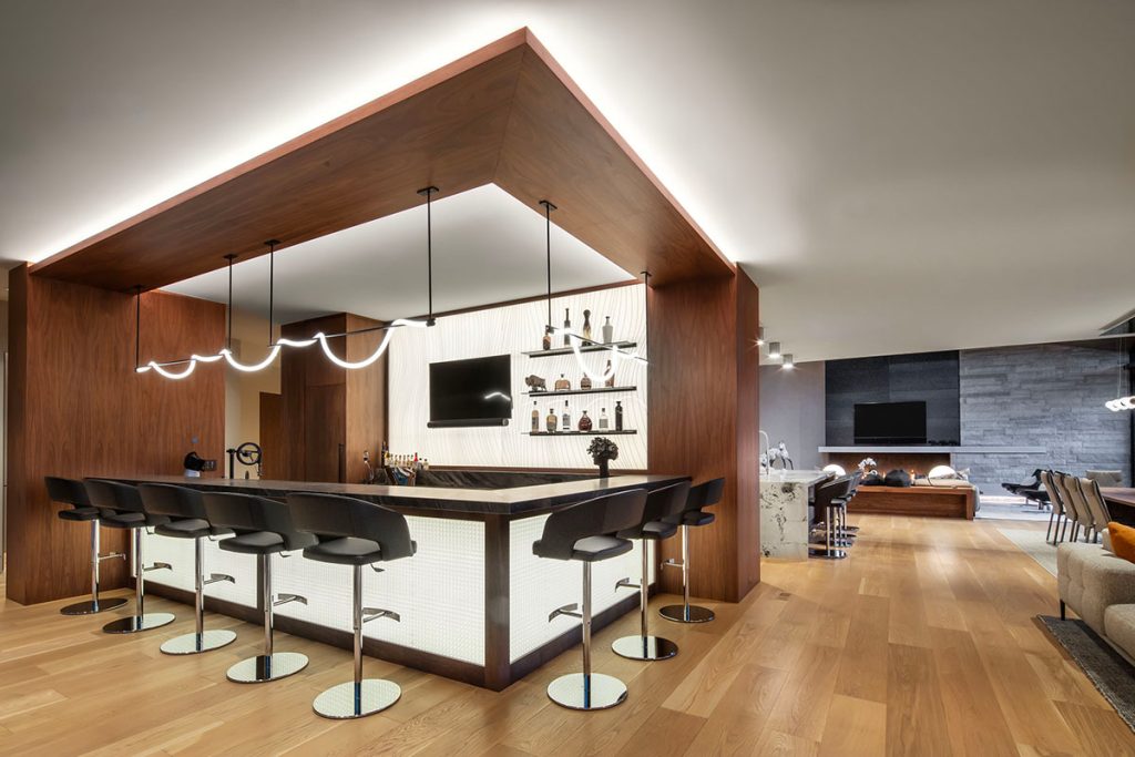 In the open-planned great room, the dining area is positioned in front of the floor-to-ceiling sliding window doors that open completely to the patio. To the right is the kitchen with seating on the island and a dropped ceiling for better lighting and more intimacy. An adjacent enclosed butler’s pantry, the same size as the kitchen, provides for food preparation and workspace so that the open-planned kitchen remains uncluttered. Beyond in the distance are the hearth room and bar.