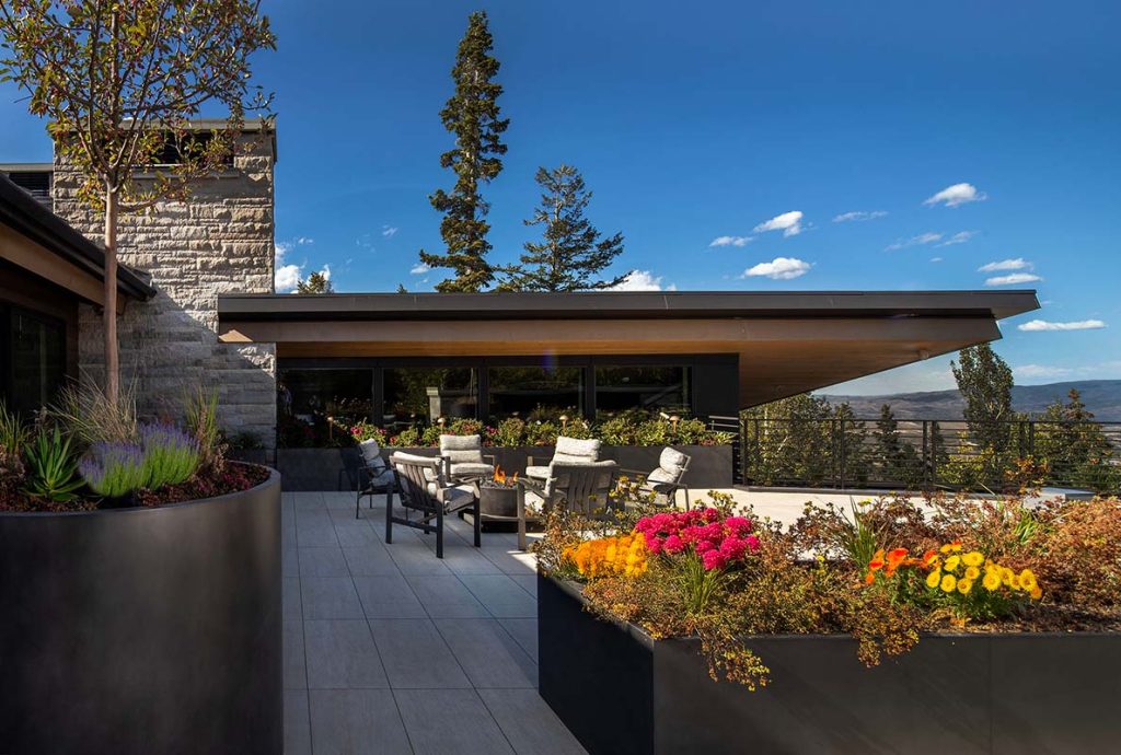 The top level has a vibrant rooftop garden. The planters are aligned by the clerestory windows we viewed in the great room. Nearby on this level is the home office, and further down the hall are two guest suites.