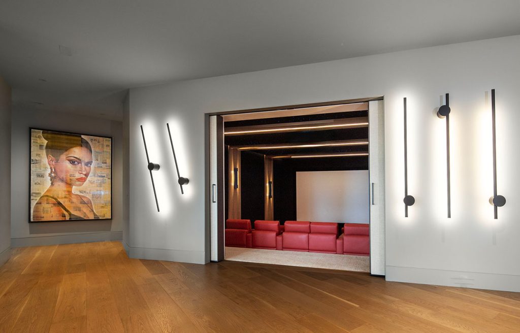 On the lower level is a family recreation room with doors leading to a dedicated home theater. Additionally, there are a home gym and guest rooms.