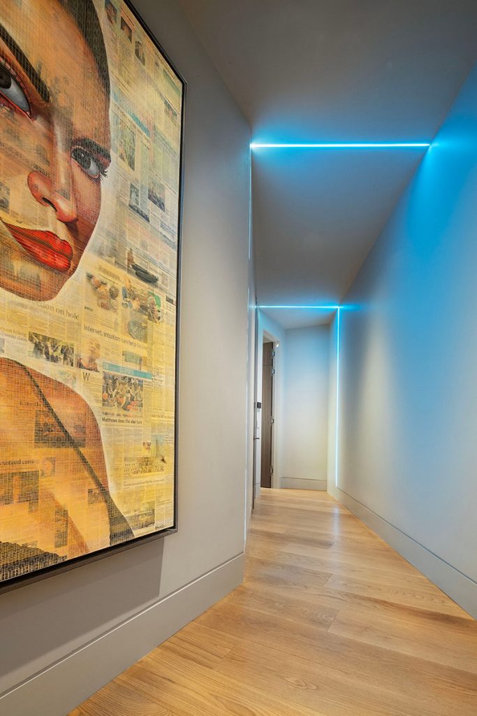 In the hallway leading to the lower-level bedroom suites and bunkroom, adjustable colored lighting adds an extra pizazz.