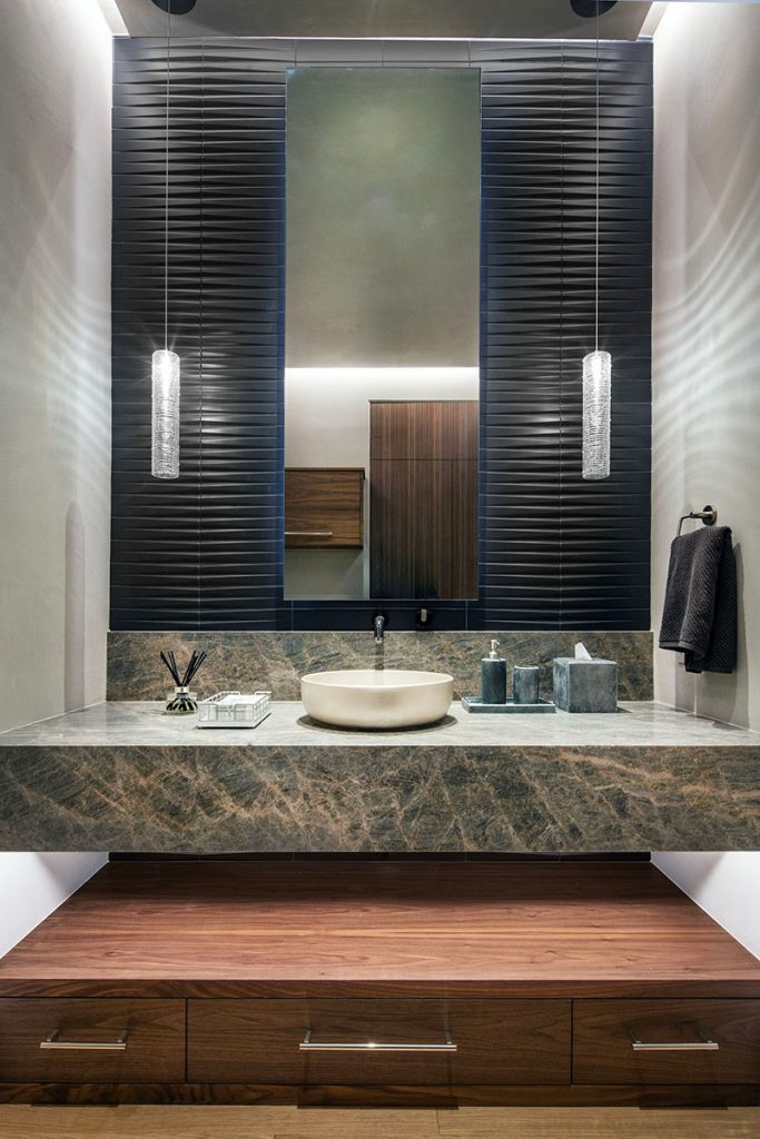 The material selections in the downstairs powder room shows a more casual look than in the upstairs.