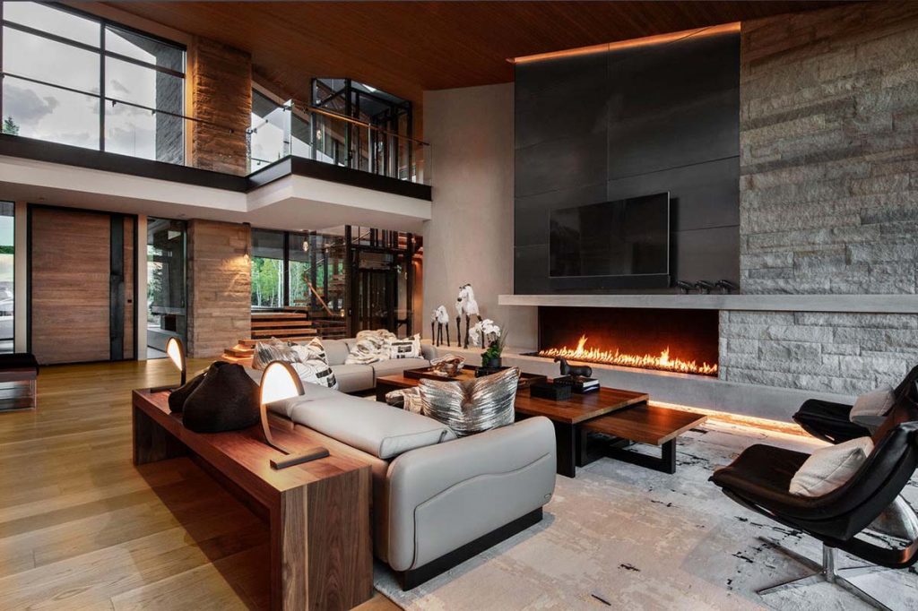 Walking in through the pivot door at the front entrance, you are met with this view of the great room. The fireplace anchors a seating area of Italian leather sofas that recline. The angular wooden ceiling lifts to the clerestory and a glimpse of the rooftop garden.