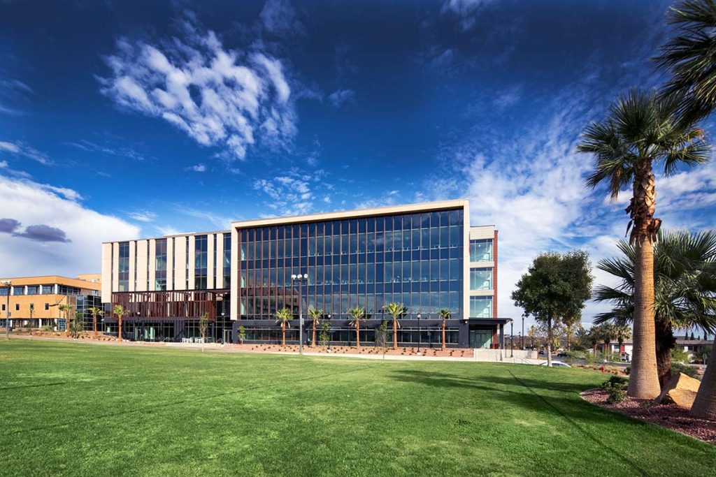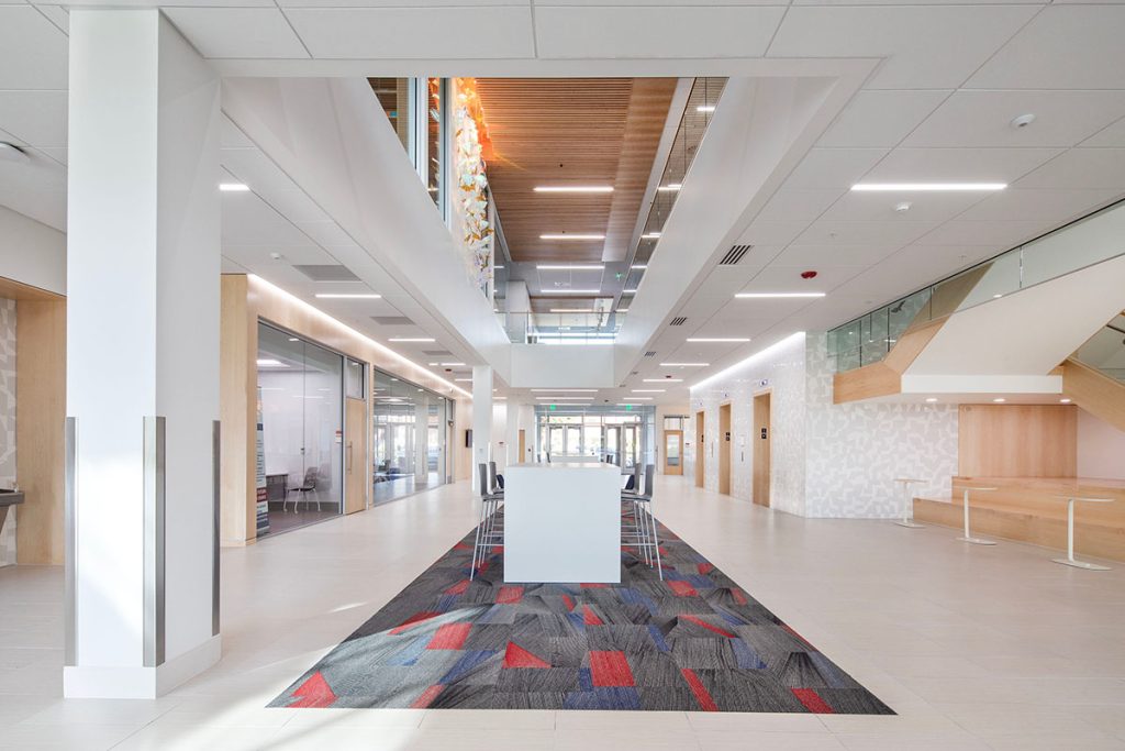 The new building adds 120,091 square feet to the campus and serves the College of Humanities and Social Sciences with lecture halls, classrooms, labs, faculty offices, academic support offices, conference rooms, and study spaces. The design brings in natural light and creates transparency.