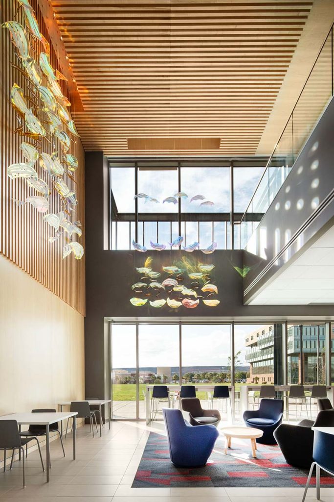 The entrance lobby is two stories with enough windows that it feels like an atrium. Glass sculptures adorn the wall and hang from the ceiling.