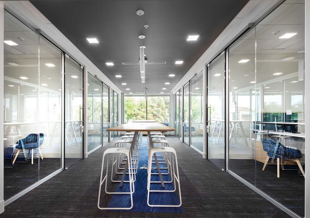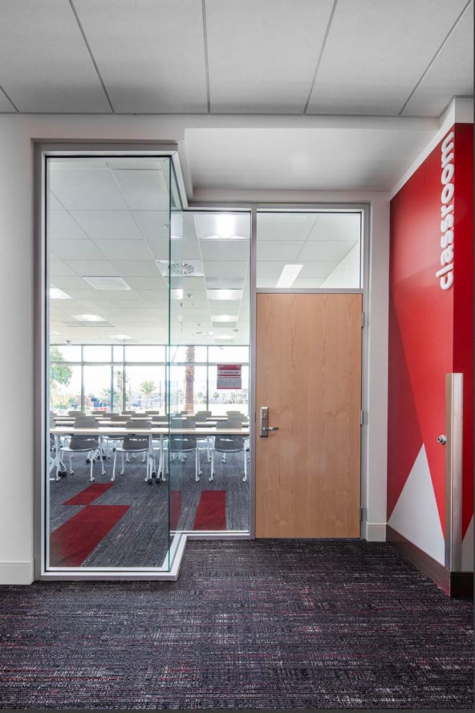 Super graphics announce the classroom. The glass surrounding the doorway offers transparency and connection. There were hallway benches for students to study while waiting for the classroom to empty. It was a nice touch that I don’t recall seeing before.