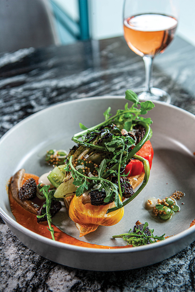 5. “We go through a lot of mushrooms, just because I love them,” Handly says. This toast highlights two varieties of fungi. The longer mushrooms are pioppinos from Wasatch Front Fungi. The morels, smaller mushrooms with a honeycomb pattern, are foraged by Adam Wong of Ogden’s Intermountain Gourmet. Handly preserves the morels in cherry wine and olive oil and then roasts and cooks them down in more wine.