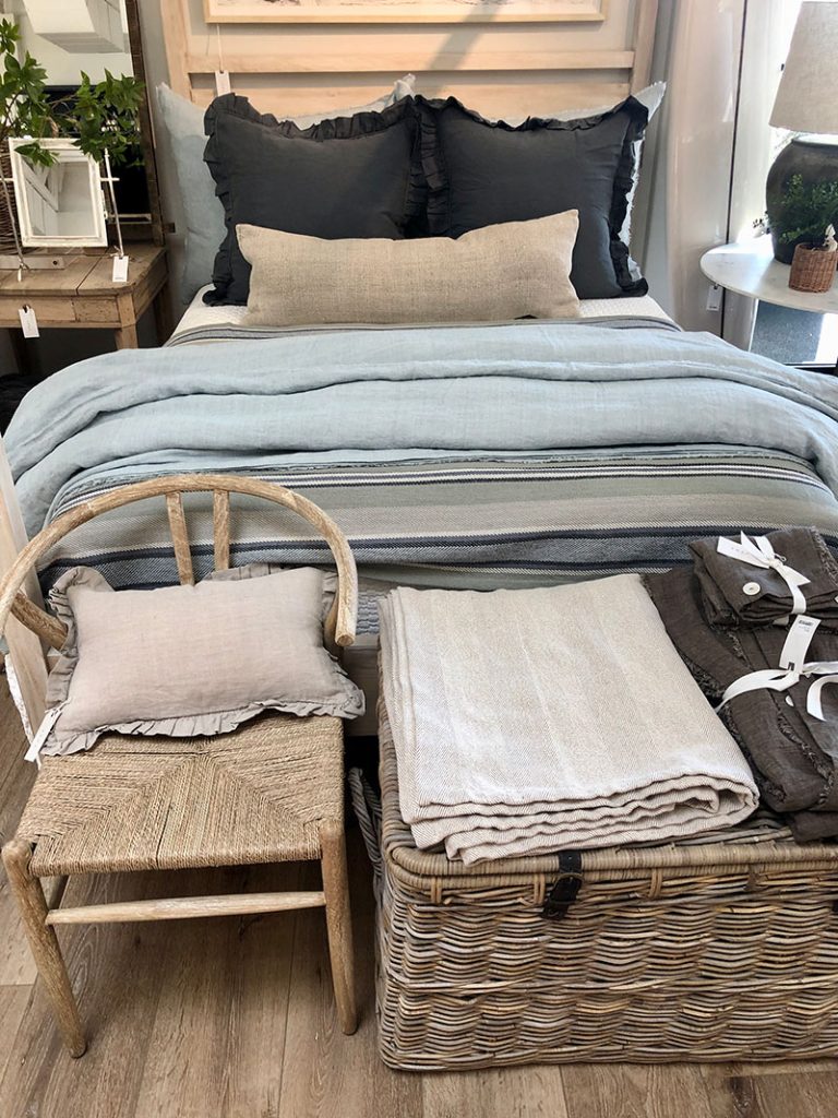 In the bedrooms, layers of soft, breathable linens and cottons create a cool, airy vibe that’s easy on the eyes—and even easier to relax into. Pale neutrals and light textures evoke sun-dried sheets and lazy afternoon naps, with beds that look—and feel—like a gentle summer breeze. Van Matre’s tip? “Take out your heavy comforter from your duvet and swap it for something lighter.” Then layer it all loosely—mixing solids with soft patterns for a casual, effortless look. “I’m a big fan of stripes—they’re classic like wicker and never go out of style. Plus, they play well with just about any other pattern.”