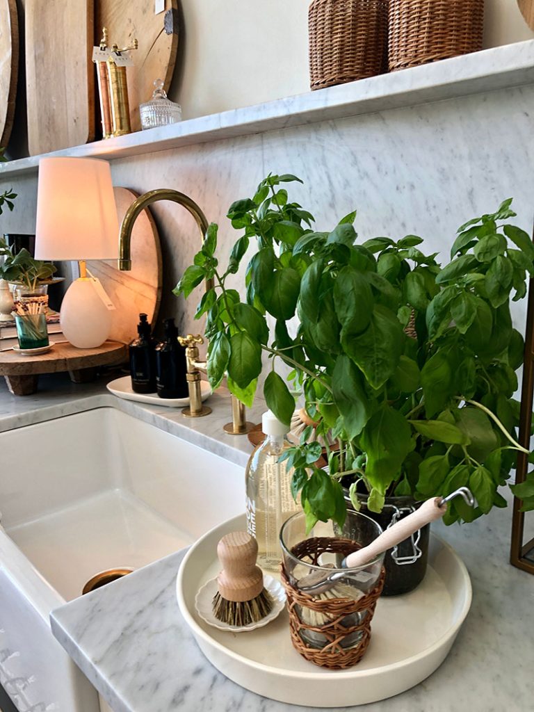Fresh greens and seasonal blooms bring a quiet vibrancy to Van Matre’s summer spaces—whether real or carefully crafted artificial pieces that feel just as alive. From a sprig of rosemary in a simple glass jar to garden clippings in vintage vases, the greenery is always loosely arranged, never overdone. “I absolutely love daisies,” she admits. Van Matre also has a soft spot for Queen Anne’s lace. She often gathers flowers or branches to place loosely around the home—a bud vase in the bathroom, a fresh stem by the bed—embracing a fresh-picked, informal feel that invites the outdoors in with effortless charm.