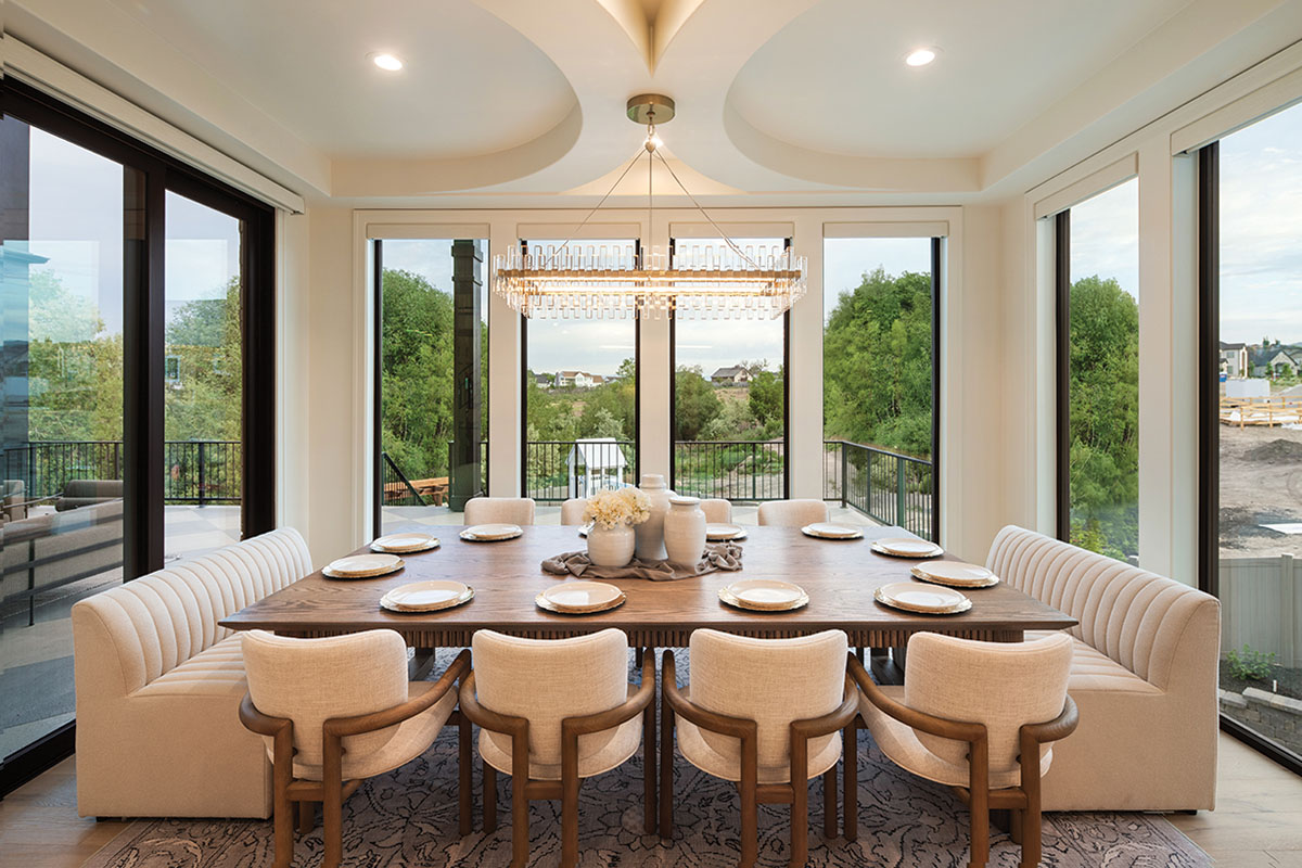 5. Custom semi-circle ceiling detail softens the hard lines and angles of a squared-off dining room in American Fork. Home by Kaizen Custom Homes; interior by Eclectic Design Co.