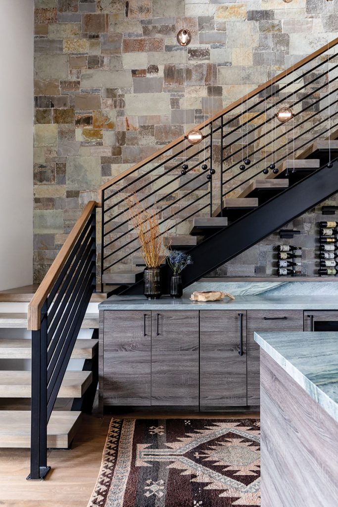 1. A four-level staircase in a Park City mountain residence revolves around a cozy gathering spot just inside the main entry. Mont Bleu quartzite atop a sleek bar teams with a rustic accent wall clad in mixed limestone varieties, echoing the home’s exterior views. Overhead, staggered pendants by Hubbardton Forge draw the eye upward through the soaring stairwell. Architecture by Upwall Design; interior by Carrie Delany. Photo by Lindsay Salazar.