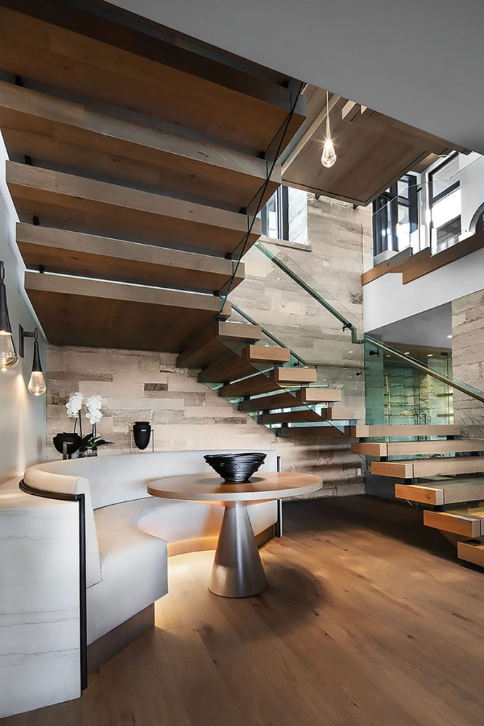 3. Complementing a mix of oak flooring, layered stone and sharp-angled glass, a boldly curved banquette anchors the dramatic stairwell of a ski-in, ski-out residence. Jewelry-like sconces and a stone-clad back wall deliver gravitas to the lounge, elevating the under-stair hideaway into a chic gathering space. Architecture by Otto/Walker Architects; build by Upland Development; interior by Mark and Aly Design. Photo by Scot Zimmerman.