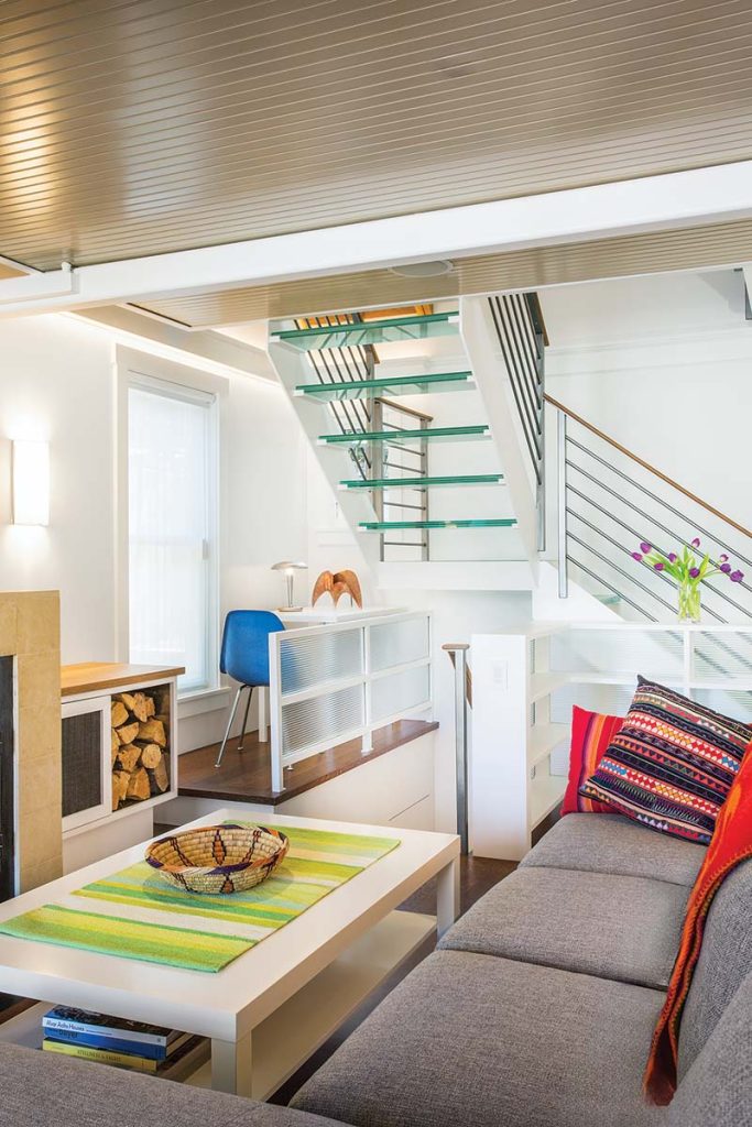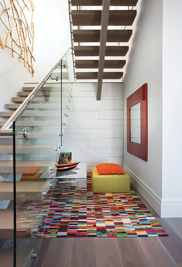 7. In smaller homes, every nook counts. In an Old Town home in Park City, an under-stair nook that some might consider unusable is fashioned into a home office. Colorful seating and intriguing lighting make the workspace pop against stark white walls and a sculptural sandblasted glass staircase. Design by Plunkett+Kuhr. Photo by Scot Zimmerman.