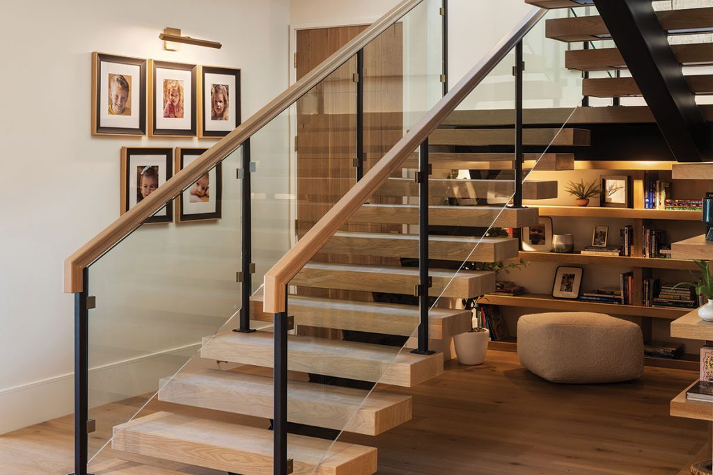 5. Clever lighting highlights a tucked-in library beneath the stairs of a home showcased in the 2025 Utah Valley Parade of Homes. Wood shelves echo the surrounding flooring and stair treads, seamlessly tying the space to the rest of the home. Directly beneath the stairs’ landing, an overstuffed ottoman provides the ultimate casual reading corner. Architecture by Upwall Design; build by Raykon Construction; interior by Interior Concepts Design House. Photo by Utah Valley Videos.