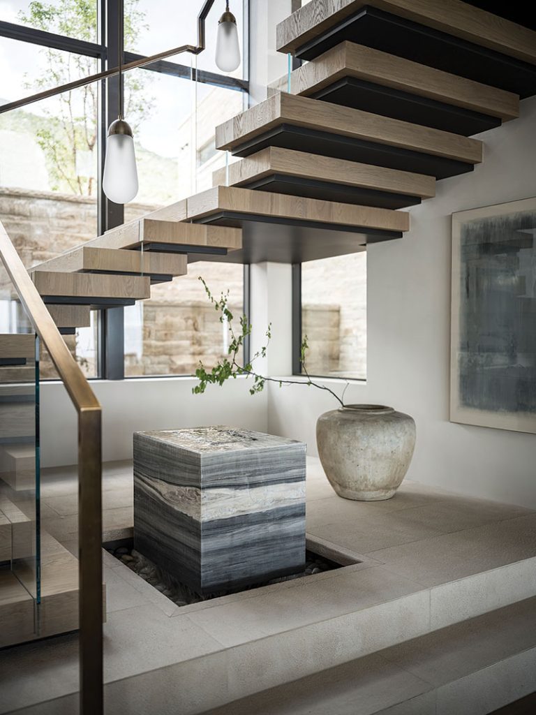 6. Beneath an artfully stacked, freestanding white oak staircase, a tranquil striated-stone fountain and elegant pottery deliver instant serenity. A solid stone platform serves as the foundation for the undulating stairs, and teardrop Apparatus pendants unite the space from above. Architecture by Upwall Design; interior by AMB Design; build by Magleby Construction. Photo by Joshua Cald