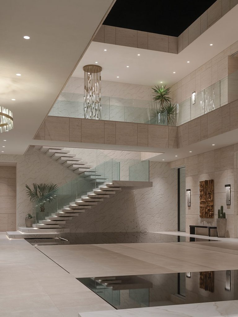 8. Designed by Utah’s Denton House Design, this Cabo home centers around an open courtyard, where cantilevered stairs in Lioli Ceramic Calacatta Borghini Satin marble connect levels of modern design. To add to the sleek aesthetic, a dark, negative-edge reflecting pool anchors the base of the jaw-dropping staircase. Interior by Denton House Design. Photo by Lance Gerber.